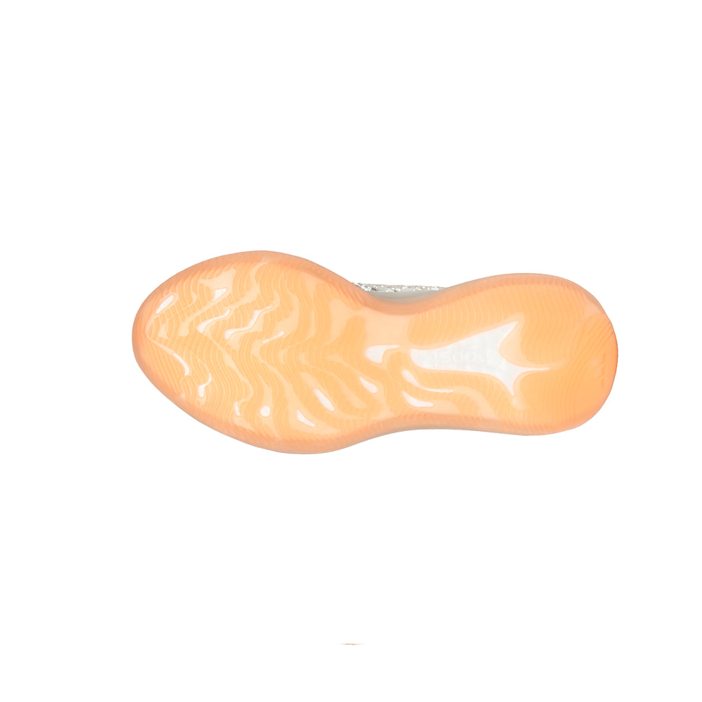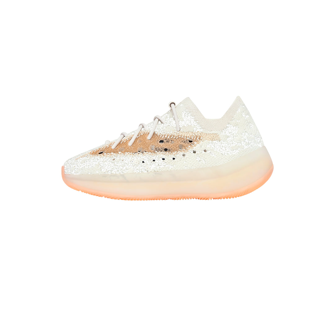 The adidas Yeezy Boost 380 Kids applies a subtle palette to a sock-like upper entirely constructed from flexible Primeknit. A camo-like pattern made up of cream and coral tones is contrasted by the sneaker’s translucent monofilament window, which enlivens the sneaker’s lateral side panel with cream coloring and a unique see-through element. The full-length Boost midsole is wrapped in semi-translucent rubber and reinforced with a coral rubber outsole.