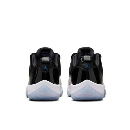 The Air Jordan 11 Low 'Space Jam' draws inspiration from the iconic high-top AJ11 of the same name. This sneaker features a black ballistic mesh upper complemented by a tonal patent leather mudguard. Rope laces thread through webbing eyelets, ensuring a secure fit. The back heel showcases a stylized ‘23’ and classic Jumpman branding. Anchoring the shoe is a white Phylon midsole equipped with full-length Air-sole cushioning and an exposed carbon fiber plate. The translucent rubber outsole boasts herringbone traction pods for superior grip.