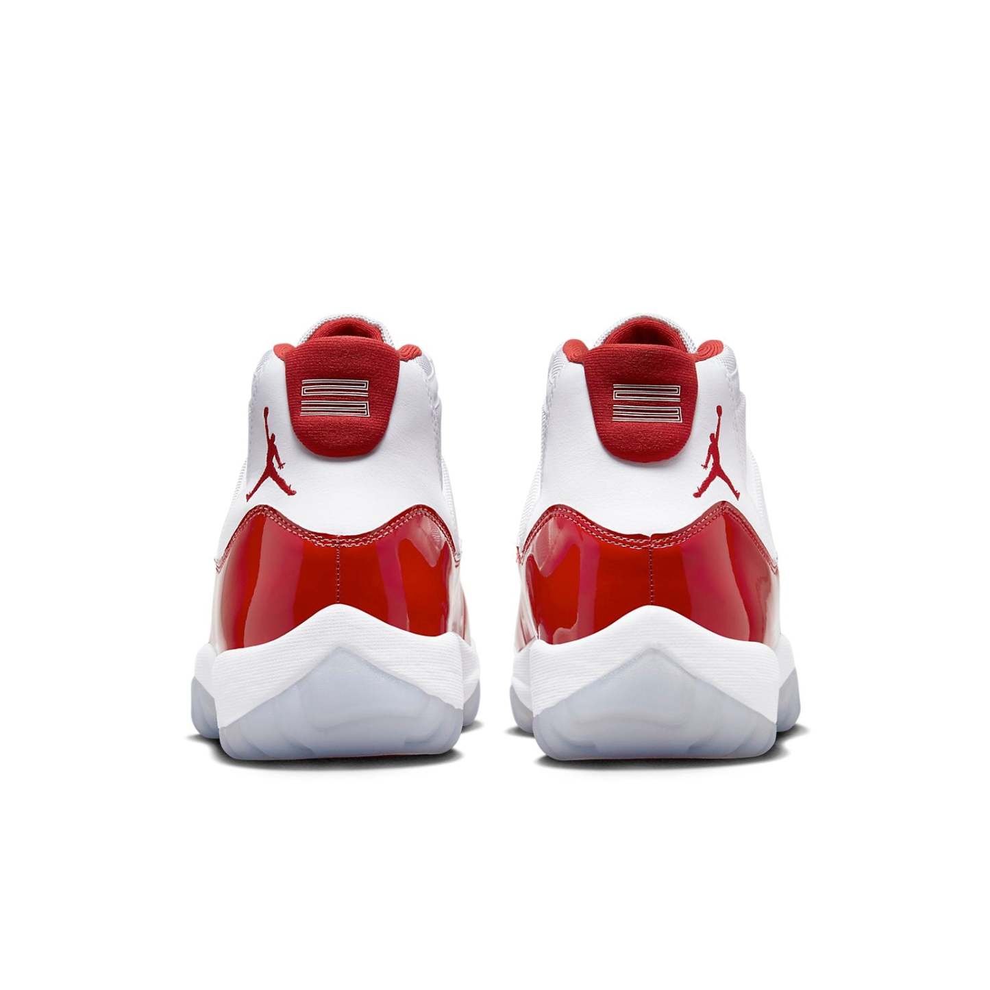The Air Jordan 11 Retro Cherry boasts a classic design with a bold Chicago style. Combining premium materials and iconic detailing, this sleek sneaker stands out from the rest. The upper is enveloped by cherry red patent leather mudguards for a stylish touch, complemented by crisp white leather as well as matching cherry red Jumpman branding. Beneath, an icy blue outsole adds further edge to the silhouette, while a signature 23 debossing adorns the heel tab for extra flair. Further innovation comes from the Carbon fiber plate at the midsole, enhancing support and durability in every step. Perfect for bringing contemporary energy and effortless style to your sneaker rotation.