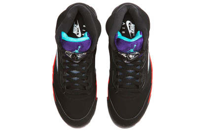 True to its name, The Nike Air Jordan 5 "Top 3" draws inspiration from a trio of iconic OG releases - the "Metallic", "Fire Red" and "Grape" colorways. Against the black nubuck upper is a vibrant purple tongue complemented by aqua blue. On the shoe is a bright red "23" lettering. Equally eye-catching is the red midsole mashed up with metallic silver shark-tooth detailing.