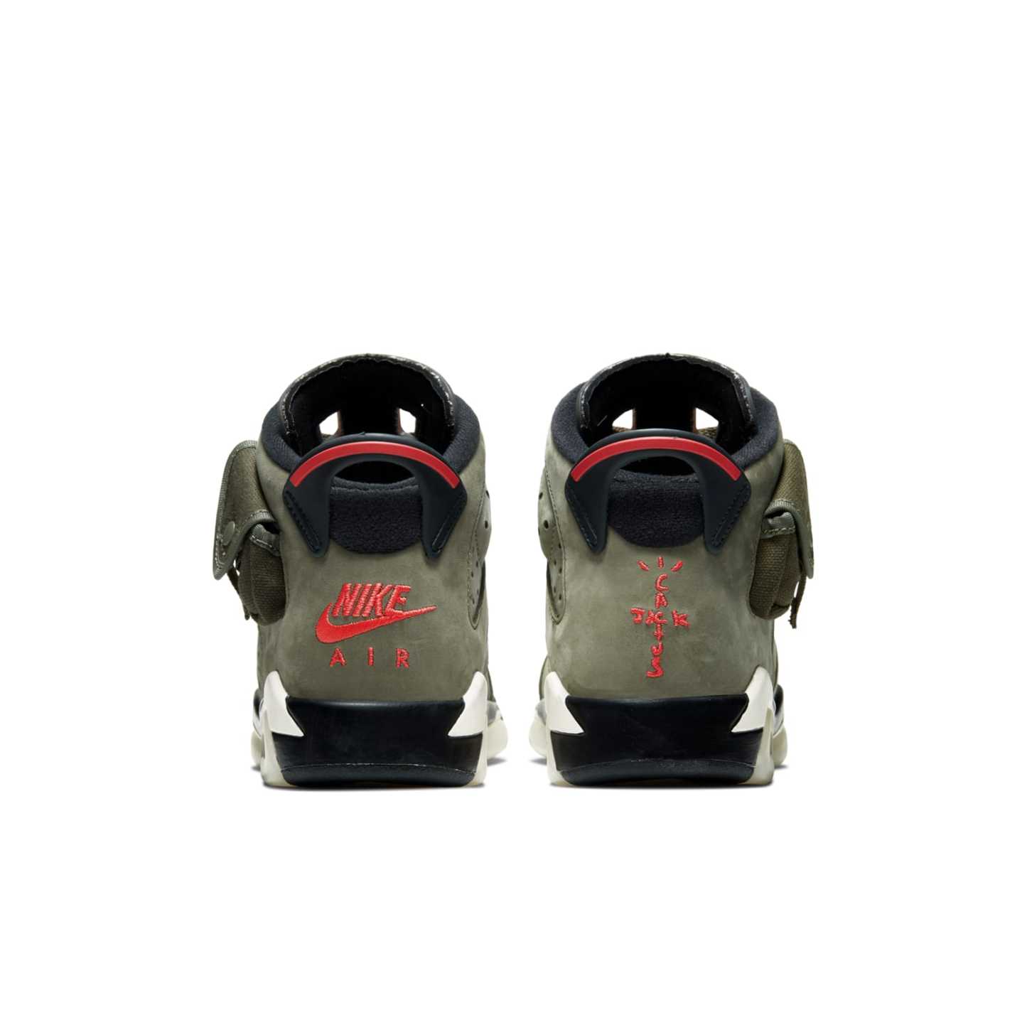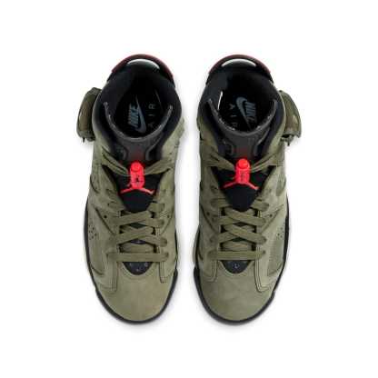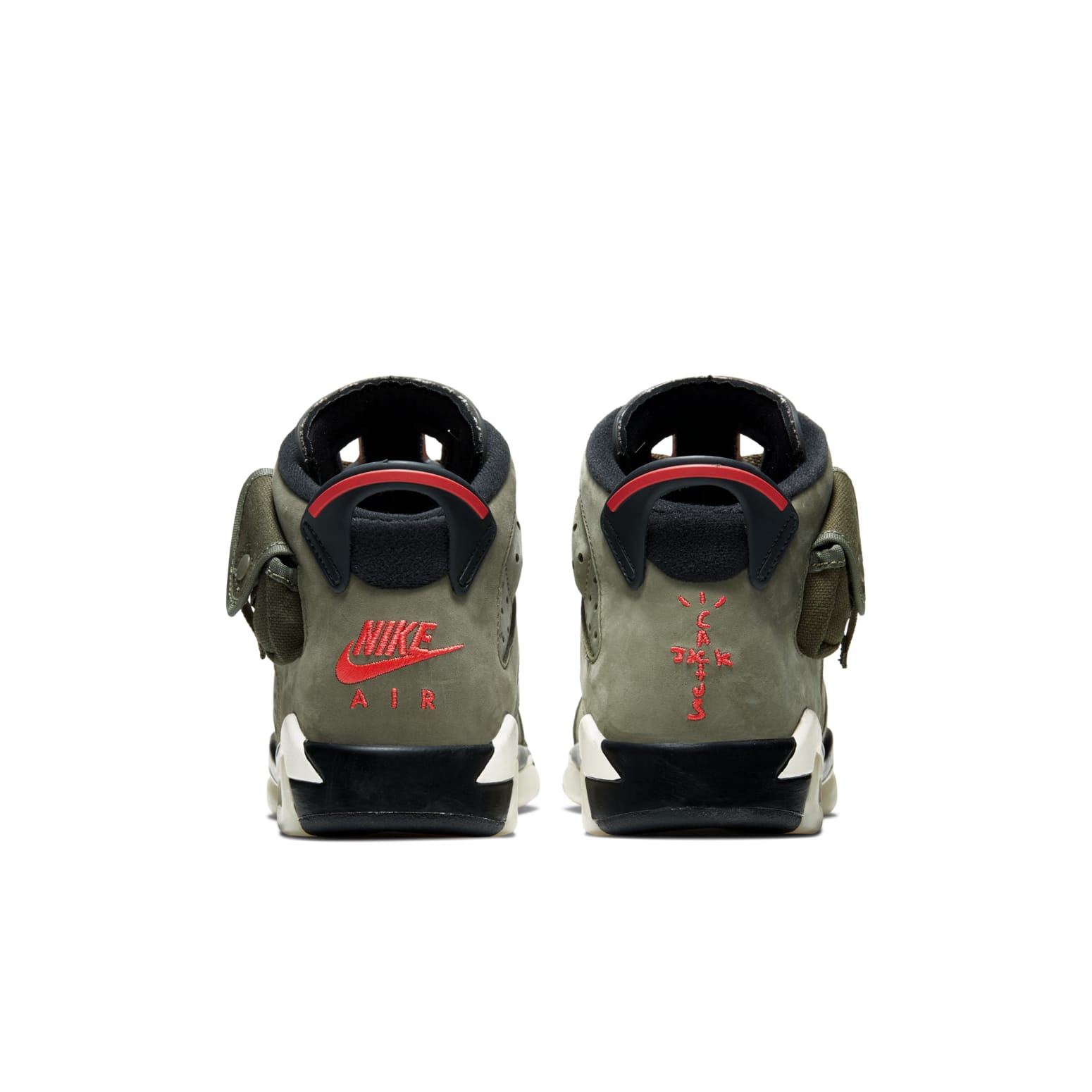 Introducing the Air Jordan 6 Retro SP GS sneaker, designed in collaboration with Travis Scott. This limited edition sneaker is built for style and comfort, with a military-inspired Olive nubuck upper, Infrared logo embroidery on the heel, reflective detailing, and a stash pocket on the ankle. The glow-in-the-dark rubber outsole provides traction and style, while the Air-enhanced midsole ensures hours of comfortable wear.